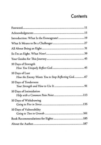 Some attributes of the Challenger: Motivation: Independence or autonomy, to be in control of themselves and free from the control of others.Biggest Fear: Being betrayed, especially by those they trust most.Gut Triad: Along with Ones and Nines, Eights are considered to be part of the gut triad. They receive information through their gut, which in layman’s terms means a bodily feeling of something being instinctively right or wrong. The sixty days of this devotional are split into six ten-day topics that include uniqueness, weakness, strength, pain points, and how Challengers react in times of stress and growth.
