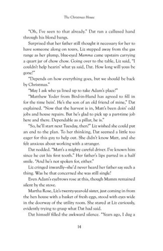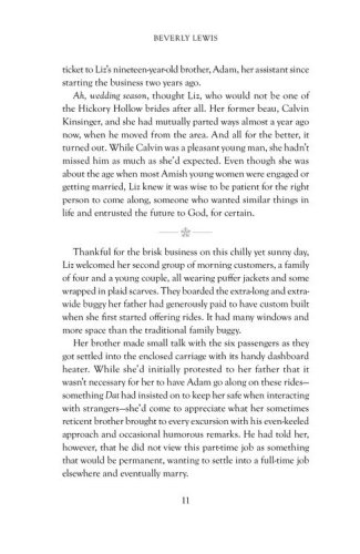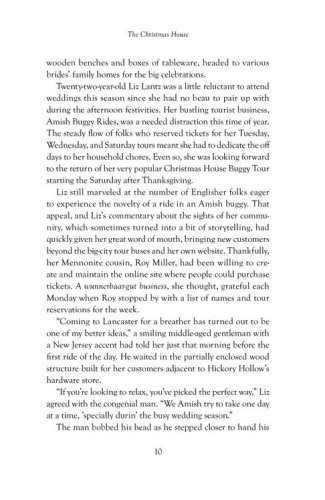 With the holidays approaching, Liz Lantz is dedicated to using her Hickory Hollow buggy tour business to share God's love with the Englisher tourists who visit her Lancaster County community. But when her father and brother are called away for a while, Dat finds a young Amishman to assist her on the tours in her brother's place, much to Liz's dismay. Regardless, the popularity of her Christmas House Buggy Tour means she could use the help, so as the countdown to Christmas begins, she works alongside Matthew Yoder, who quickly takes a genuine interest in the tour customers–and Liz.