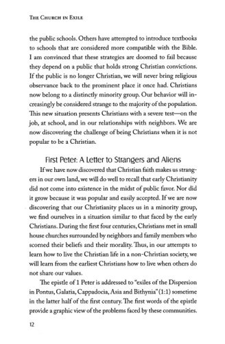 During the first four centuries, Christians met in small house churches surroundedby neighbors and even family members who scorned their beliefs and their morality.1 Peter was written to such believers. The "alien" Christians who first read 1 Peter werenot strangers in their own lands because of their skin colors or their nationalities.Their obedience to the call of Christ had made them exiles.