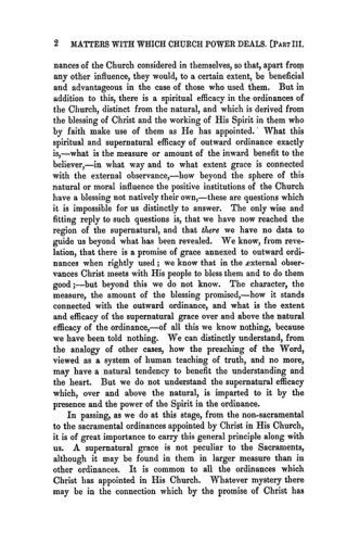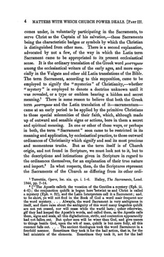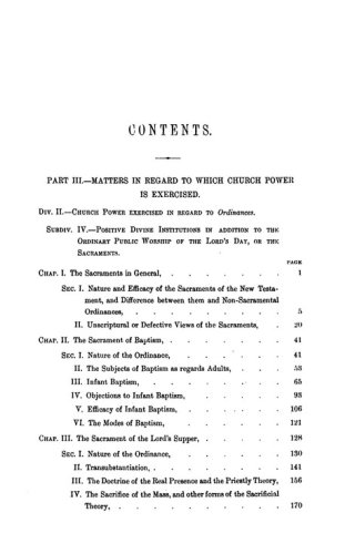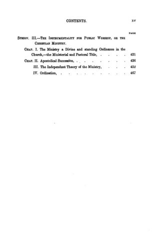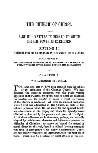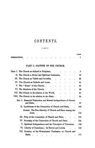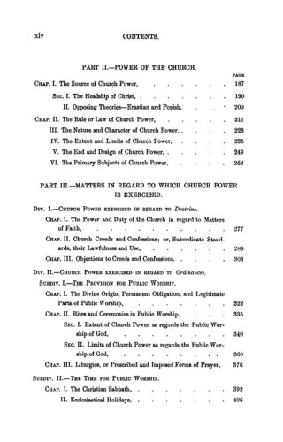 Volume one of this two volume work entitled The Church of Christ deals with the nature and power of the Church, containing a lengthy explanation of the church in relation to the state, which is arguably one of the best treatments on this topic available. From there it deals with matters in regard to which church power is exercised (i.e. in regard to doctrine, ordinances, the instrumentality and time of public worship; with a discussion of holy days and confessions).