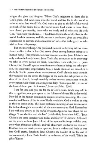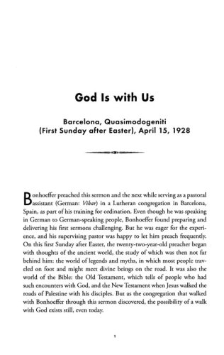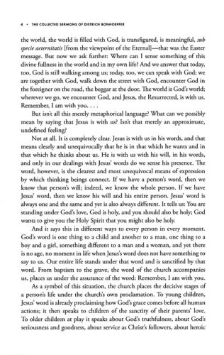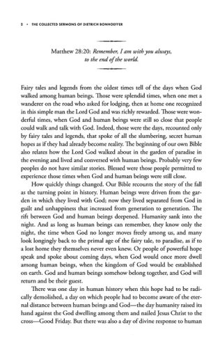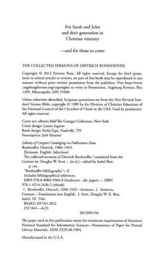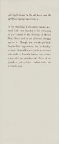 In his preaching, Bonhoeffer's strong, personal faiththe foundation for everything he didshines in the darkness of Hitler's Third Reich and in the church struggle against it. Though not overtly political, Bonhoeffer's deep concern for the developments in his world is revealed in his sermons as he seeks to draw the listener into conversation with the promises and claims of the gospela conversation readers today are invited to join.