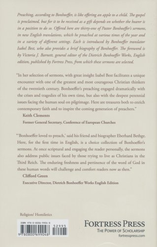 Preaching, according to Bonhoeffer, is like offering an apple to a child. The gospel is proclaimed, but for it to be received as gift depends on whether or not the hearer is in a position to do so. Offered here are thirty-one of Pastor Bonhoeffer's sermons, in new English translations, which he preached at various times of the year and in a variety of different settings. Each is introduced by Bonhoeffer translator Isabel Best who also provides a brief biography of Bonhoeffer. The foreword is by Victoria J. Barnett, general editor of the Dietrich Bonhoeffer Works, English edition, published by Fortress Press, from which these sermons are selected.