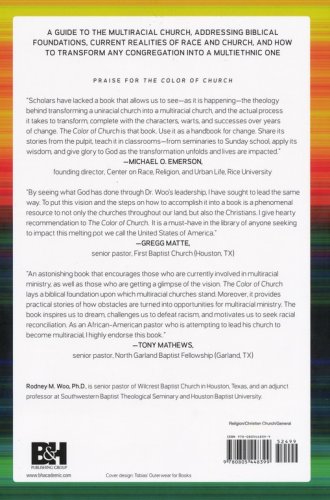 The Color of Church unfolds the story of how God has helped Wilcrest understand the biblical principles of a multiracial church that He progressively revealed in Scripture. Each chapter parallels the biblical model or mandate and the Wilcrest transformation story from a uniracial to a multiracial congregation. In 1992, Wilcrest had 180-200 people in worship of which 98% were anglo. Today, the congregation of 450-550 is represented by 44 different countries with an anglo population of less than 40%. The Color of Church adopts the definition that a multiracial congregation is composed of racially diverse believers united by their faith in Christ, who make disciples of all the nations in the anticipation of the ultimate racial reunion around the throne of God.