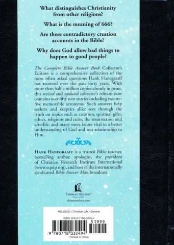 The Complete Bible Answer Book is a comprehensive guide covering more than 170 of the top questions that the Bible Answer Man has been asked throughout the past 40 years of his ministry. Updated topics include creation and our existence, basic apologetics, spiritual gifts, religions and cults, the resurrection and afterlife, and many more issues vital to a better understanding of God and our relationship to Him. Each question is answered in Hanegraaff’s scholarly yet easy-to-understand style, and he even suggests additional sources for readers who want to explore the topics further.