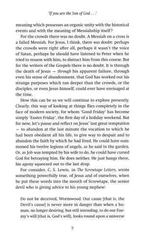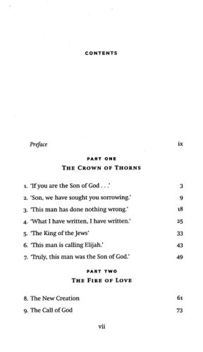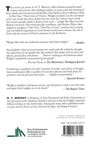 In Part One, "The Crown of Thorns," Wright considers not the customary seven last words that Jesus spoke from the cross but, rather, seven words that various people spoke to Jesus on the cross — people like Mary and the Roman centurion, who witnessed the crucifixion, and Pontius Pilate, who helped to instigate it. Part Two, "The Fire of Love," contains five sermons and one biblical exposition on such themes as the new creation, the call of God, and the nature of Christ's presence in the Eucharist.