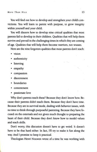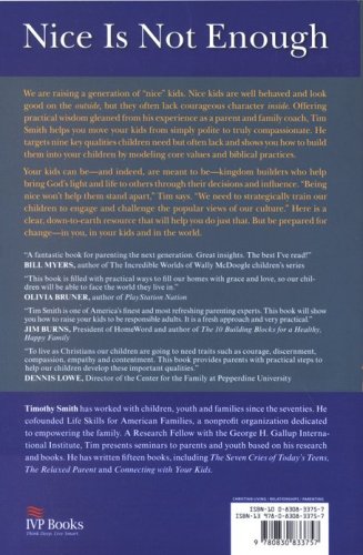 Nice is not enough. We are raising a generation of "nice" kids. Nice kids are well behaved and look good on the outside, but they often lack courageous character inside. Offering practical wisdom gleaned from his experience as a parent and family coach, Tim Smith helps you move your kids from simply polite to truly compassionate. He targets nine key qualities children need but often lack and shows you how to build them into your children by modeling core values and biblical practices. Your kids can be–and indeed, are meant to be–kingdom builders who help bring God's light and life to others through their decisions and influence. "Being nice won't help them stand apart," Tim says. "We need to strategically train our children to engage and challenge the popular views of our culture." Here is a clear, down-to-earth resource that will help you do just that. But be prepared for change–in you, in your kids and in the world.