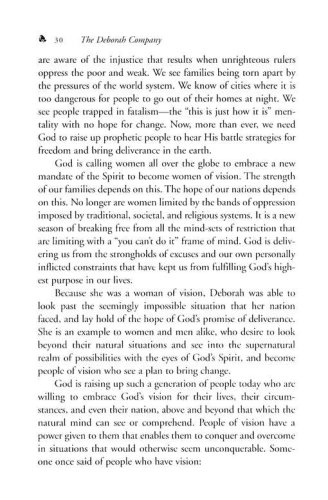 The Deborah Company is an inspiring look at how God is using women to impact the earth through employing divine strategies for breakthrough. In Judges 4 the prophetess and judge, Deborah, brought freedom to her land through hearing the voice of the Lord