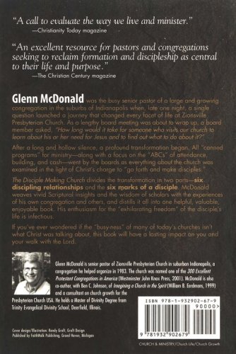 Review This is an excellent resource for pastors and congregations seeking to reclaim formation and discipleship as central to their life and purpose. –The Christian Century magazine, October 2005 Product Description In a recent study, pollster George Barna stated that the number one topic of interest for church leaders today is discipleship. Not growth, not pastoral care, not evangelism. Discipleship. According to E. Stanley Ott, President of The Vital Churches Institute, There is no person more qualified to address the greatest need in the church today than Glenn McDonald that of showing how the local church can grow vital disciples. In his easy going writing style, author Glenn McDonald tells the story of how he, as the busy pastor of a large and growing suburban church near Indianapolis was struggling with the ABCs of attendance, building and cash. One evening at the end of another church board meeting one of his elders asked a simple question. How long would it take for someone who visits our church to learn about his or her need for Jesus and to find out what to do about it? From that night forward the entire focus of the church changed. All canned programs for ministry were ended as everything about the church was examined in the light of Christ s charge to go forth and make disciples. The Disciple Making Church is presented in two parts six discipling relationships and six marks of a disciple. McDonald weaves vivid Scriptural insights and the wisdom of scholars with the experiences of his own congregation and others, and distills it all into one helpful, valuable and enjoyable book. If you ve ever wondered if the busyness of many of today s churches isn t what Christ was talking about, this book will have a lasting impact on your church.