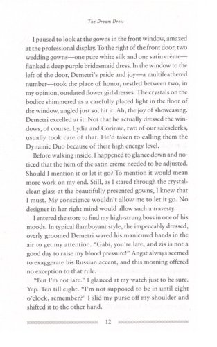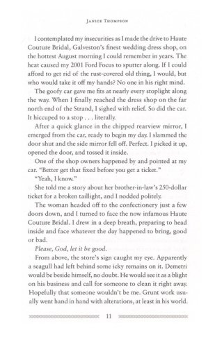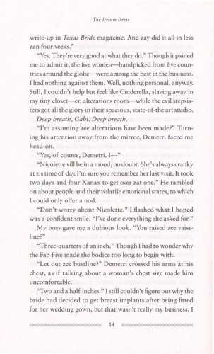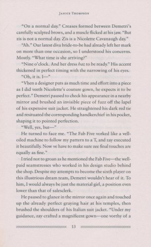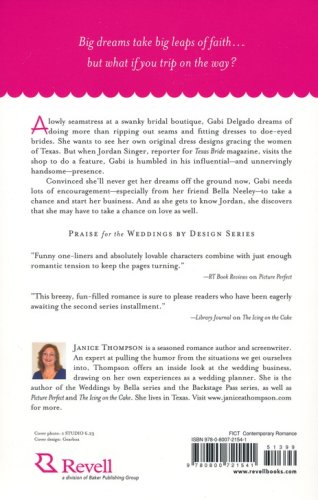 A seamstress at a swanky bridal boutique, Gabi Delgado dreams of doing more than ripping out seams and fitting dresses to doe-eyed brides. She wants to see her own dress designs gracing the young women of Texas. When Jordan Spencer, the editor of Texas Bride magazine visits the shop to do a feature, Gabi is devastated to lose her job in his very influential presence. Convinced she'll never get her dreams off the ground now, Gabi needs lots of encouragement–especially from her friend Bella Neeley–to take a chance and start her business. And as she gets to know Jordan, she discovers that she may have to take a chance on love as well. Could it be that she'll have to design her own wedding dress soon?