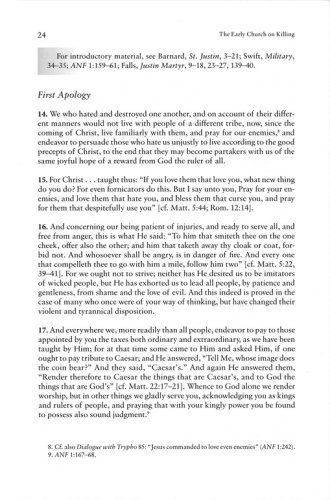 This book provides in English translation all extant data directly relevant to the witness of the early church until Constantine on killing. Primarily, it draws data from early church writings, but other evidence, such as archaeological finds and Roman writings, is included.