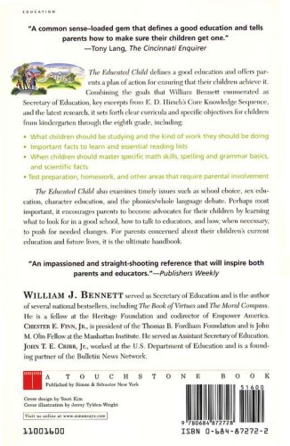 The Educated Child also examines timely issues such as school choice, sex education, character education, and the phonics/whole language debate. Perhaps most important, it encourages parents to become advocates for their children by learning what to look for in a good school, how to talk to educators, and how, when necessary, to push for needed changes. For parents concerned about their children's current education and future lives, it is the ultimate handbook.