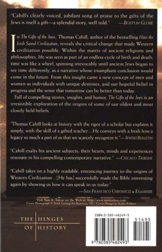 The Gifts of the Jews reveals the critical change that made western civilization possible. Within the matrix of ancient religions and philosophies, life was seen as part of an endless cycle of birth and death; time was like a wheel, spinning ceaselessly. Yet somehow, the ancient Jews began to see time differently. For them, time had a beginning and an end; it was a narrative, whose triumphant conclusion would come in the future. From this insight came a new conception of men and women as individuals with unique destinies–a conception that would inform the Declaration of Independence–and our hopeful belief in progress and the sense that tomorrow can be better than today. As Thomas Cahill narrates this momentous shift, he also explains the real significance of such Biblical figures as Abraham and Sarah, Moses and the Pharaoh, Joshua, Isaiah, and Jeremiah.