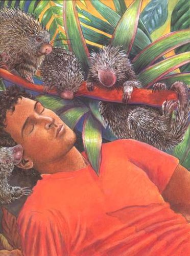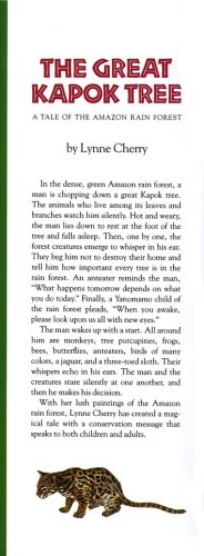 Lynne Cherry journeyed deep into the rain forests of Brazil to write and illustrate this gorgeous picture book about a man who exhausts himself trying to chop down a giant kapok tree. While he sleeps, the forest’s residents, including a child from the Yanomamo tribe, whisper in his ear about the importance of trees and how "all living things depend on one another" . . . and it works. Cherry’s lovingly rendered colored pencil and watercolor drawings of all the "wondrous and rare animals" evoke the lush rain forests. Features stunning world maps bordered by detailed illustrations of fascinating rainforest creatures. An IRA Teacher’s Choice (1991), ABA’s Pick of the Lists, Reading Rainbow Review Book, NSTA-CBC Outstanding Trade Book for Children.
