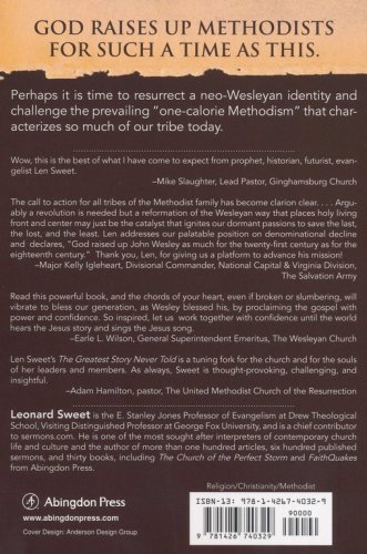 God raises up Methodists for such a time as this. Here is a ditty Len Sweet’s Methodist grandfather used to sing: A Methodist, a Methodist will I be A Methodist will I die. I’ve been baptized in the Methodist way And I’ll live on the Methodist side. What "genius" of Methodism inspired this kind of love and loyalty in the earlier years of the faith? What did it mean to live in "the Methodist way" and to die on "the Methodist side?" Perhaps it is time to resurrect a neo-Wesleyan identity and to challenge the prevailing "one-calorie Methodism" that characterizes so much of our tribe today. What makes a Methodist? How can we re-ignite the spark of genius that motivated such commitment in our cloud of witnesses? The essence of Methodism’s genius resides in two famous Wesleyan mantras: "heart strangely warmed" (inward experiences with a fire in the heart) and "the world is our parish" (outward experiences with waterfalls of cutting-edge intelligence). For Wesley, internal combustion, the former, led to external combustion, the latter. In the 18th century, Methodists in general (and in their younger years, the Wesley brothers themselves) were accused of being too "sexy." What else could all those "love feasts" and "strangely warmed hearts" be about? Why else were all those women in positions of leadership? With this book the author hopes to bring back to life some of Methodism’s sexiness so that our current reproduction crisis can be reversed.