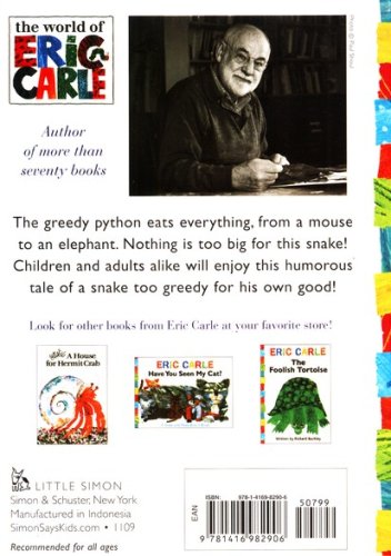Last published as a board book in 1998, this classic story whimsically illustrated by Eric Carle returns with refreshed colors and layout, and a fresh new cover design. Children and adults alike will enjoy this hilarious tale of a snake too greedy for his own good!