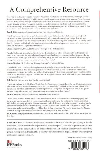 The fruit of years of training, research and counseling experience, Janelle Hallman has drawn together a comprehensive resource for those who are interested in understanding and counseling women in conflict with same sex attraction. In this ground-breaking work, Hallman sets forth the unique dimensions of struggle that women experience through the presentation of research, interviews and clinical experience. This is an indispensable guide for understanding and a manual for counseling adult women seeking to "mature in giving and receiving love in all of [their] relationships, and no longer be restricted by destructive relational patterns." From the Author Why did you decide to write The Heart of Female Same-Sex Attraction? Janelle Hallman: Because I found myself deeply involved in the lives of many Christian friends who had same-sex attraction, during the late eighties and early nineties I devoured just about every book out there on homosexuality and gender. However, almost everything I could find was for and about men. I could see that much of the material didn't apply to women. Neither was there a clinical book that was understandable for the average counselor who hadn't been trained in psychoanalytic literature. We (my friends and I) wanted to gain a deeper psychological and theological understanding related to people?s diverse experience of sexual attractions and sexual and gender identities. I knew that when I started my counseling practice in the mid-nineties, which was primarily focused on women with same-sex attraction, I would basically have to "learn as I went," or in other words, invite my clients to teach me. There simply was no published framework from which to practice. Even back then I thought that it might be a possibility that I would be the one to write a book. I knew I loved research and certainly teaching and was therefore able to condense complicated material and organize it in a way that people could understand. But I set this thought aside so that I could focus on simply learning how to counsel women with same-sex attraction. After contacting all of the other female therapists and a few male therapists specializing in this field, it was determined that no one else wanted to undertake the ultimate task of developing a manuscript, but many said they would support my efforts. So in 2004, I began the process by interviewing over fifty sexual minority women, 10 or so mothers of lesbian daughters, and several somewhat seasoned professionals who also regularly worked with faith-based sexual minority individuals. I then started mapping out an outline for the book. The Heart of Female Same-Sex Attraction is especially important not only because nothing else exists for clinicians or for pastoral counselors in helping Christian women with same-sex attraction, but also because these women struggle with trust. Many have been wounded and retraumatized by insensitive or ill-informed counselors and pastors. I have a great passion to protect these women by educating their helpers. Hopefully, the misunderstandings and presumptions on the part of helpers and caretakers will begin to be eliminated due to this publication.