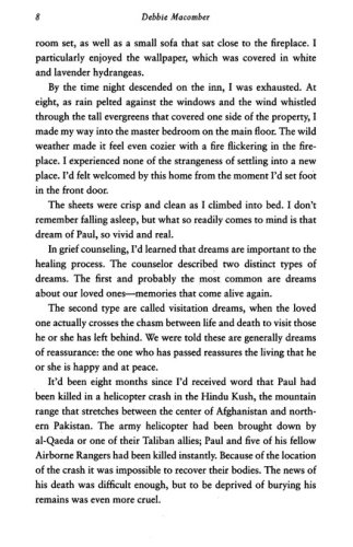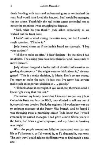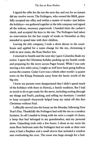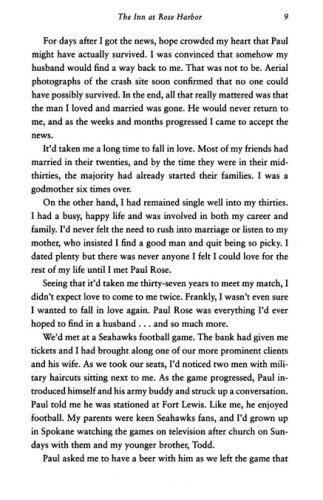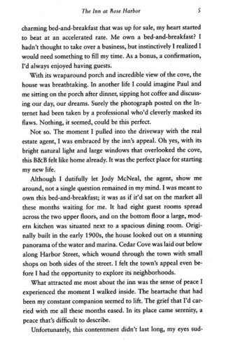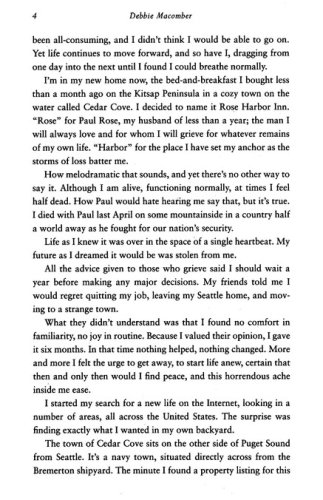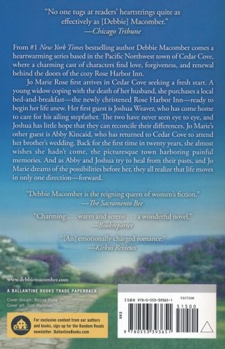 Jo Marie Rose first arrives in Cedar Cove seeking a sense of peace and a fresh start. Coping with the death of her husband, she purchases a local bed-and-breakfast—the newly christened Rose Harbor Inn—ready to begin her life anew. Yet the inn holds more surprises than Jo Marie can imagine.