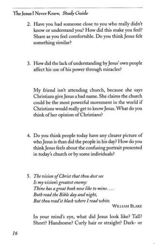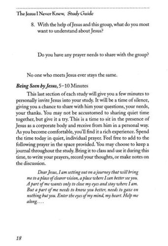 Voted Book of the Year Philip Yancey’s bestselling book The Jesus I Never Knew peeled away popular stereotypes to present a brilliant and fascinating portrait of Christ. Now individuals and groups can join Yancey in this probing look at Jesus Christ—his teachings, his miracles, his death and resurrection, and ultimately, who he was and why he came. This study guide helps readers press beyond the traditional picture to uncover a Jesus who is brilliant, creative, challenging, fearless, compassionate, unpredictable, and ultimately satisfying. Each chapter begins with Yancey’s reflections on rediscovering Jesus. Questions that stimulate journaling follow, with note-writing sections that assist the reader in· Seeing Jesus through Scripture· Looking at Jesus Within and Without· Being Seen by Jesus· Further Glimpses of Jesus· Gazing on Jesus This Week Also included are Yancey’s suggestions for viewing Hollywood films on Jesus, with optional directions about film usage in studying The Jesus I Never Knew.