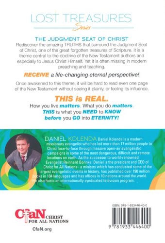 From the Lost Treasures Series Rediscover the amazing TRUTHS that surround the Judgment Seat of Christ, one of the great forgotten treasures of Scripture. It is a theme central to the doctrine of the New Testament authors and especially to Jesus Christ Himself. Yet it is often missing in modern preaching and teaching. RECEIVE a life-changing eternal perspective Once awakened to this theme, it will be hard to read even one page of the New Testament without seeing it plainly, or feeling its influence.THIS is REAL. How you live matters. What you do matters. THIS is what you NEED to KNOW before you GO into ETERNITY