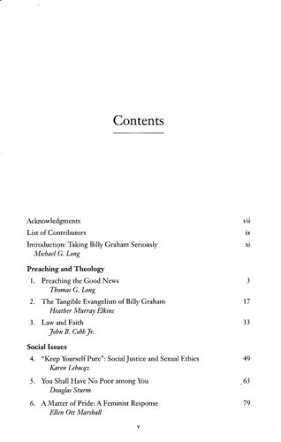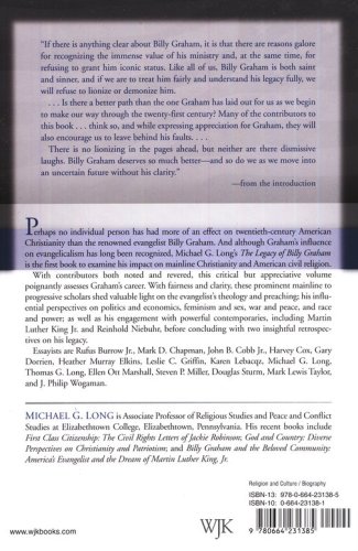 Perhaps no individual has had more of an effect on twentieth-century American Christianity than the renowned evangelist Billy Graham, whose work has been widely influential in arenas from the rising evangelical movement to the White House. Although Graham's influence on evangelicalism has long been recognized, Michael G. Long's The Legacy of Billy Graham is the first book to examine his impact on mainline Christianity and on American civil religion. With noted contributors including John B. Cobb Jr., Harvey Cox, Gary Dorrien, Karen Lebacqz, Thomas G. Long, Mark Lewis Taylor, and J. Philip Wogaman, this critical but generally appreciative volume assesses Graham's career from the perspectives of preaching and theology, social issues, and his engagement with his contemporaries and then concludes with two retrospectives on his legacy.