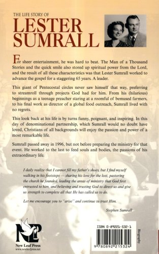 An extraordinary biography of an extraordinary man An important historical look at a pillar of Pentecostalism Built-in audience among charismatics and evangelicals Filled with photos and incredible tales of ministry An epilogue of the continuing ministry of Lester Sumrall has been added by his son, Stephen. Few evangelists have seen as much of the world as Lester Sumrall witnessed — and witnessed to. When he died in 1996, Sumrall had spent 65 years serving the Lord, and this thoroughly entertaining biography examines the life of one of the most colorful preachers of the 20th century.