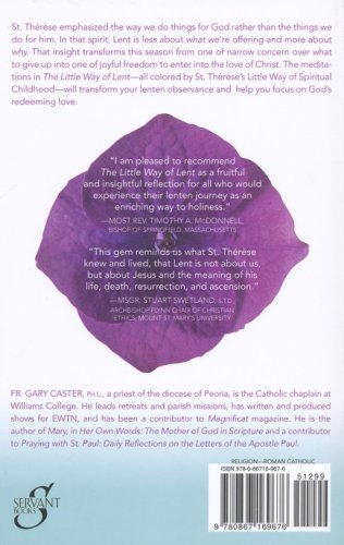 While reading the autobiography of St. Thérèse, Fr. Caster had an 'ah ha' moment that transformed his experience of Lent from one of narrow concern over what to give up to one of joyful freedom to enter into the sacrificial love of Jesus Christ. "What struck me," he says, "was her insistence on the way we do things for God and not the things we do for him. It wasn't about what I was offering; it was about why." The daily Lenten meditations in this book—all colored by St. Thérèse's Little Way of Spiritual Childhood—will transform you, too, helping you focus not so much on what you have done to offend God, but on what he has done to redeem you.