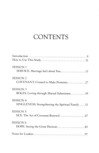 Service: Marriage Isn't about You (24:00)Covenant: Created to Make Promises (20:00)Roles: Loving through Mutual Submission (25:00)Singleness: Strengthening the Spiritual Family (23:00)Sex: The Act of Covenant Renewal (20:00)Hope: Seeing the Great Horizon (23:00)