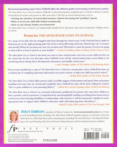 Renowned parenting expert Stacy DeBroff offers the ultimate guide to becoming a school-savvy parent. The Mom Book Goes to School combines DeBroff's trademark pragmatic, insightful advice with the collective wisdom of hundreds of teachers and parents to offer more than 1,500 tips on school-related issues, such as:
