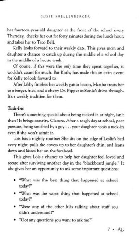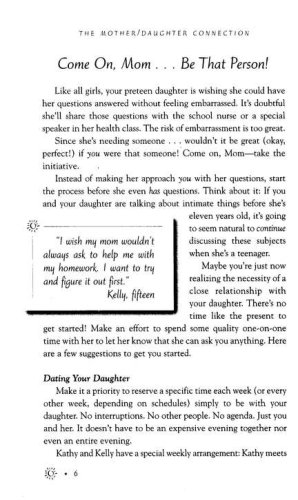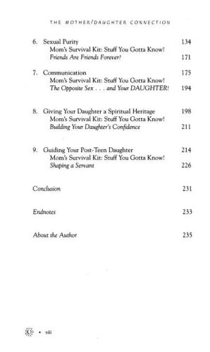 The Mother Daughter Connection is a book designed to help mothers form intimate, working relationships with their daughters by giving mothers an insider's view of their daughters' thoughts and feelings. The editor of Brio magazine for girls and a veteran youth expert, Susie Shellenberger helps mothers understand the angst and confusion teen girls feel when coping with such issues as body image, fashion envy, dating, fear of failure, and sharing one's faith. With creative questions, conversation starters, and diary entries, mothers are given the tools to not only help their daughters, but also to learn the "stuff they gotta know" to help their daughters survive the teenage years.