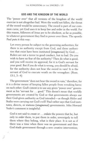 The church was established to serve the world with Christ-like love, not to rule the world. It is called to look like a corporate Jesus, dying on the cross for those who crucified him, not a religious version of Caesar. It is called to manifest the kingdom of the cross in contrast to the kingdom of the sword. Whenever the church has succeeded in gaining what most American evangelicals are now trying to get – political power – it has been disastrous both for the church and the culture. Whenever the church picks up the sword, it lays down the cross. The present activity of the religious right is destroying the heart and soul of the evangelical church and destroying its unique witness to the world. The church is to have a political voice, but we are to have it the way Jesus had it: by manifesting an alternative to the political, "power over," way of doing life. We are to transform the world by being willing to suffer for others – exercising "power under," not by getting our way in society – exercising "power over."