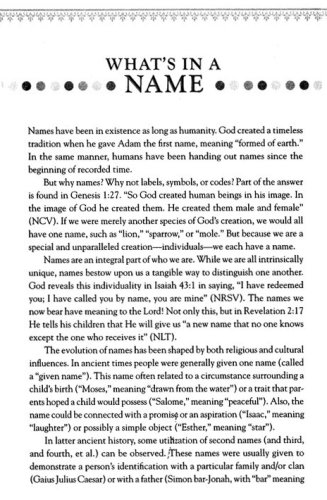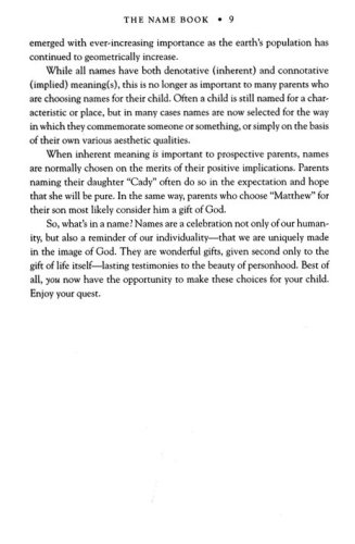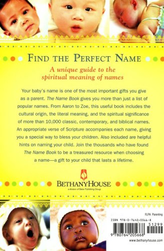 Baby-naming has become an art form with parents today, but where do parents go to find names and their meanings? The Name Book offers particular inspiration to those who want more than just a list of popular names. From Aaron to Zoe, this useful book includes the cultural origin, the literal meaning, and the spiritual significance of more than 10,000 names. An appropriate verse of Scripture accompanies each name, offering parents a special way to bless their children.