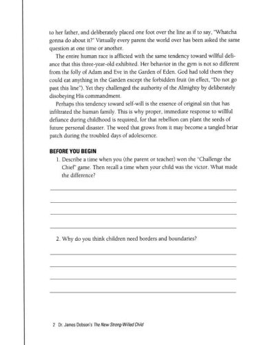 This workbook will equip parents, either individually or in a small group setting, with practical skills so that they can competently raise their strong-willed child. Parents will be encouraged through real-life examples and case studies and will learn how to apply the knowledge and guidelines found in Dr. Dobson's new book The New Strong-Willed Child.