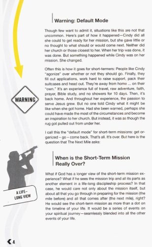The Next Mile resources are designed to assist local churches and agencies plan and conduct effective ministry. Participants in the short-term mission experience include the goer, sender, local church, goer's family, mentor, host and those to whom the STMer ministers. The mission experience that is well-planned and carried out will affect the life of each participant in their continuing journey to become more like Christ. Included in the Goer Guide is a spiritual journal with daily Bible readings and space to journal, record thoughts from Scripture and write prayer requests. This helpful tool begins 14 days before departure and continues for 7 days after the conclusion of a short-term trip. In a sealed envelope inside the Goer Guide is a Mentor Guide that serves as a simple, yet powerful and practical resource for Mentors.