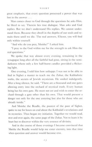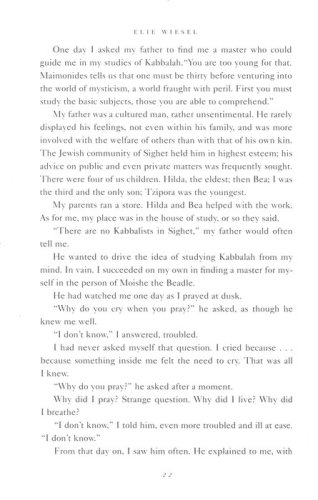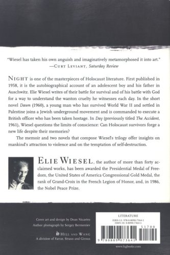 Night is one of the masterpieces of Holocaust literature. First published in 1958, it is the autobiographical account of an adolescent boy and his father in Auschwitz. Elie Wiesel writes of their battle for survival and of his battle with God for a way to understand the wanton cruelty he witnesses each day. In the short novel Dawn (1960), a young man who has survived World War II and settled in Palestine joins a Jewish underground movement and is commanded to execute a British officer who has been taken hostage. In Day (previously titled The Accident, 1961), Wiesel questions the limits of conscience: Can Holocaust survivors forge a new life despite their memories? Wiesel's trilogy offers insights on mankind's attraction to violence and on the temptation of self-destruction.