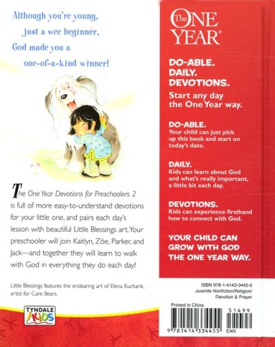 Watch your young children grow in their understanding of God as you meet with Him together using this One Year devotional. Each reading includes a Little Blessings illustration with a short Bible verse and devotional thought that gets you and your child talking about the simple truths of Scripture. A fun, rhyming prayer completes each devotional.