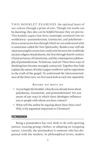 Although the three “Isms” of postmodernism, polytheism, and the ancient heresy of Gnosticism seem unrelated, this booklet shows that all three are part of the ancient religious worldview of Creator-denying "Oneism"—that seeks to impose significant elements of a pagan civilization on our once "Christian" Western culture. Peter Jones, a commentator on pagan influences in our culture, shows us what these three “-Isms” are, how they have morphed into new forms in modern culture, and what effects they are having. With a clearer understanding of the coherence of this opposing spiritual system, which comes in many forms, Christians will be empowered to make a clear and fearless declaration of the superiority of biblical "Twoism"—that God is utterly separate from his creation—and promote the gospel of reconciliation with the personal Creator through the atoning blood of the only mediator, Jesus.