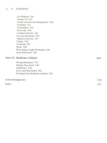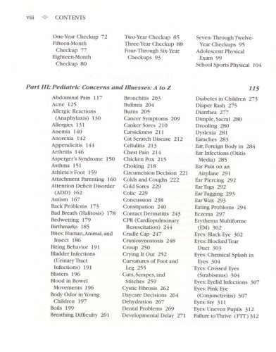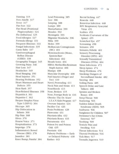 Among the scores of topics covered: teething; sprains and broken bones; nosebleeds; measles; ear infections; choking; rashes; colic; headaches; eating disorders; fever; hip pain; warts; allergies; obesity; seizures; Asperger's Syndrome; bronchitis; masturbation; sunburns; pneumonia; speech delay; lice; vomiting; asthma; heart defects; blisters; sleep problems; and more.