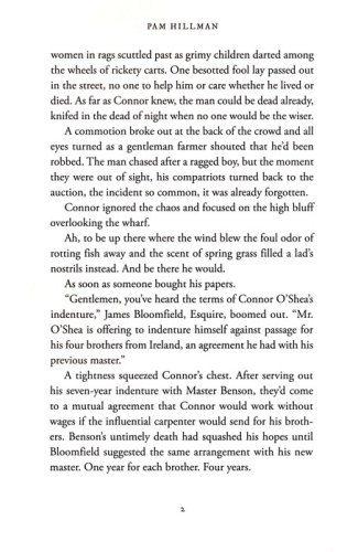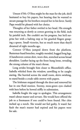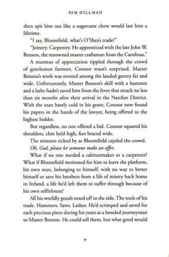 The responsibilities of running Breeze Hill have fallen on Isabella’s shoulders after her brother was found dead in the swamps along the Natchez Trace and a suspicious fire devastated their crops, almost destroyed their home, and left her father seriously injured. Even with Connor’s help, Isabella fears she’ll lose her family’s plantation. Despite her growing feelings for the handsome Irish carpenter, she seriously considers accepting her wealthy and influential neighbor’s proposal of marriage.