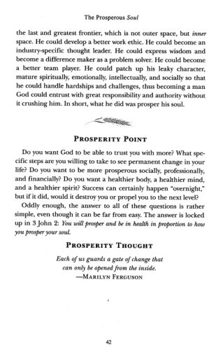 Get ready to… Make daily choices that position you to fulfill your dreams Embrace prosperity in every area of your life: Spiritually, mentally, physically, relationally, vocationally, and financially. Discover the 40 key practices for living your most prosperous life A prosperous soul is your all-access pass to living a rich life. As your soul prospers, every area of your life will follow suit. Why wait? Start prospering today!