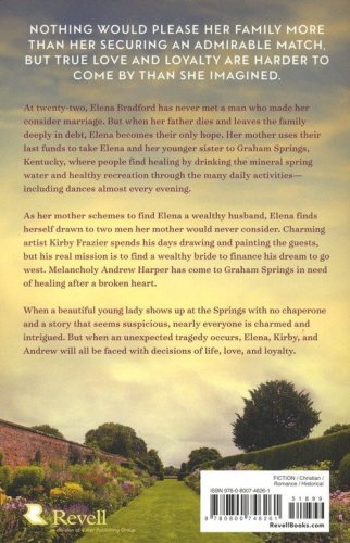 As her mother schemes to find Elena a wealthy husband, Elena finds herself drawn to two men her mother would never consider. Charming artist Kirby Frazier spends his days drawing and painting the guests, but his real mission is to find a wealthy bride to finance his dream to go west. Melancholy Andrew Harper has come to Graham Springs in need of healing after a broken heart.