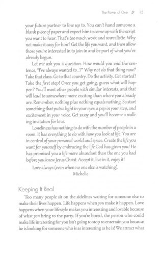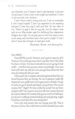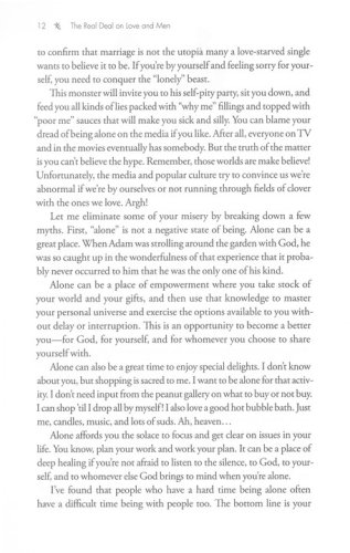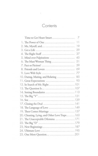 "Get a Life"Finding and creating opportunities to meet godly men "The Man/Woman Thing"Understanding and appreciating gender differences "Closing the Deal"Identifying deal breakers and deal makers while dating "Cheating, Lying, and Other Love Traps"When to stay and when to leave "New Beginnings"Gleaning wisdom from setbacks and then moving on "Marriage"Exploring expectations and establishing traditions