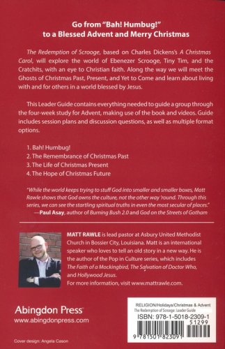 Is redemption possible for Ebenezer Scrooge? Pastor and author Matt Rawle believes so as he discovers the teachings of Jesus in the words of the Charles Dickens classic A Christmas Carol. Rawle dives deep into the dark, sad, greedy world of Scrooge and discovers a man in dire need of a second chance. Along with Scrooge, we meet the Ghosts of Christmas Past, Present, and Future and in the process learn about living with and for others in a world blessed by Jesus. Rediscover and reinvigorate your Christian faith this Advent and Christmas season and look at this familiar classic through the lens of faith. The Leader Guide contains everything needed to guide a group through the 4-week study for Advent, making use of the book and videos. Guide includes session plans and discussion questions, as well as multiple format options. Sessions include: Bah! Humbug! The Remembrance of Christmas Past The Life of Christmas Present The Hope of Christmas Future