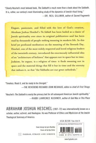 Elegant, passionate, and filled with the love of God's creation, Abraham Joshua Heschel's The Sabbath has been hailed as a classic of Jewish spirituality ever since its original publication-and has been read by thousands of people seeking meaning in modern life. In this brief yet profound meditation on the meaning of the Seventh Day, Heschel introduced the idea of an "architecture of holiness" that appears not in space but in time Judaism, he argues, is a religion of time: it finds meaning not in space and the material things that fill it but in time and the eternity that imbues it, so that "the Sabbaths are our great cathedrals."