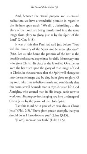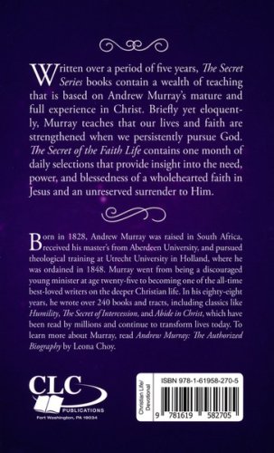 Written over a period of five years, The Secret Series books contain a wealth of teaching that is based on Andrew Murray's mature and full experience in Christ. Briefly yet eloquently, Murray teaches that our lives and faith are strengthened when we persistently pursue God. The Secret of the Faith Life contains one month of daily selections that provide insight into the need, power, and blessedness of a wholehearted faith in Jesus and an unreserved surrender to Him.