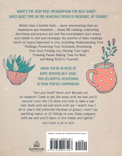 Better than a bubble bath…more rejuvenating than an expensive spa treatment…these 180 calming, comforting devotions and prayers are just the nourishment your weary soul needs to rest and recharge. Six months of daily readings touch on topics important to you, including–Understanding Your Feelings, Protecting Your Schedule, Nourishing Your Soul, Finding Joy, Shining Your Light, Pressing Pause, Making Time for Rest, and Being Kind to Yourself.