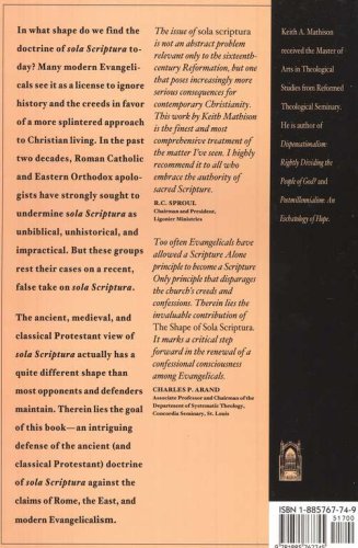 In what shape do we find the doctrine of sola Scriptura today? Many modern Evangelicals see it as a license to ignore history and the creeds in favor of a more splintered approach to the Christian living. In the past two decades, Roman Catholic and Eastern Orthodox apologists have strongly tried to undermine sola Scriptura as unbiblical, unhistorical, and impractical. But these groups rest their cases on a recent, false take on sola Scriptura. The ancient, medieval, and classical Protestant view of sola Scriptura actually has a quite different shape than most opponents and defenders maintain. Therein lies the goal of this book-an intriguing defense of the ancient (and classical Protestant) doctrine of sola Scriptura against the claims of Rome, the East, and modern Evangelicalism. "The issue of sola Scriptura is not an abstract problem relevant only to the sixteenth-century Reformation, but one that poses increasingly more serious consequences for contemporary Christianity. This work by Keith Mathison is the finest and most comprehensive treatment of the matter I've seen. I highly recommend it to all who embrace the authority of sacred Scripture." -R.C. Sproul, Ligonier Ministries