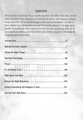 Teen devotions in The Simple Truth Bible include: A Bible passage with a short explanation of Scripture and how it relates to students' lives"Talking with God"—Insights to help teenagers turn their thoughts into prayers as they spend time with GodIdeas to follow if students want to spend more than a few minutes each day with GodPerspective on how that day's passage fits into the big picture of the BibleAn index of Bible verses by themeAdditional articles help in the teen faith journey with topics including making the Bible smaller, praying, journaling, sharing your God-story, and more. Help students join a generation of teenagers committed to experiencing God's constant, daily presence in their lives!