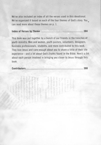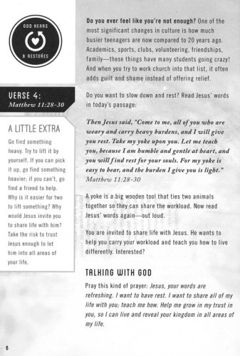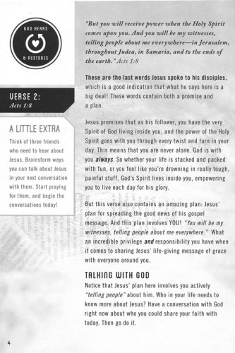 Through each devotion, teenagers will discover how to experience life-shaping, thought-provoking truths that bring wisdom and hope in the midst of daily struggles and tough times. As teens study the Bible, they will learn how God deeply and passionately loves them, how to build an authentic friendship with Jesus, and how they were created to lead a life of impact beyond high school, in this world and for eternity.