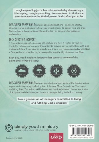 The Simple Truth Bible features 365 daily devotionals for students—each one a tasty, bite-size morsel that powerfully reveals what it means to deeply love and trust God, to lead a Jesus-centered life, and to lean on Scripture for guidance and wisdom for daily student life.