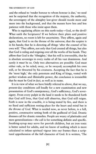 'Present day conditions', writes the author, 'call loudly for a new examination and new presentation of God's omnipotence, God's sufficiency, God's sovereignty. From every pulpit in the land it needs to be thundered forth that God still lives, that God still observes, that God still reigns. Faith is now in the crucible; it is being tested by fire, and there is no fixed and sufficient resting-place for the heart and mind but in the throne of God. What is needed now, as never before, is a full, positive, constructive setting forth of the Godhood of God.'